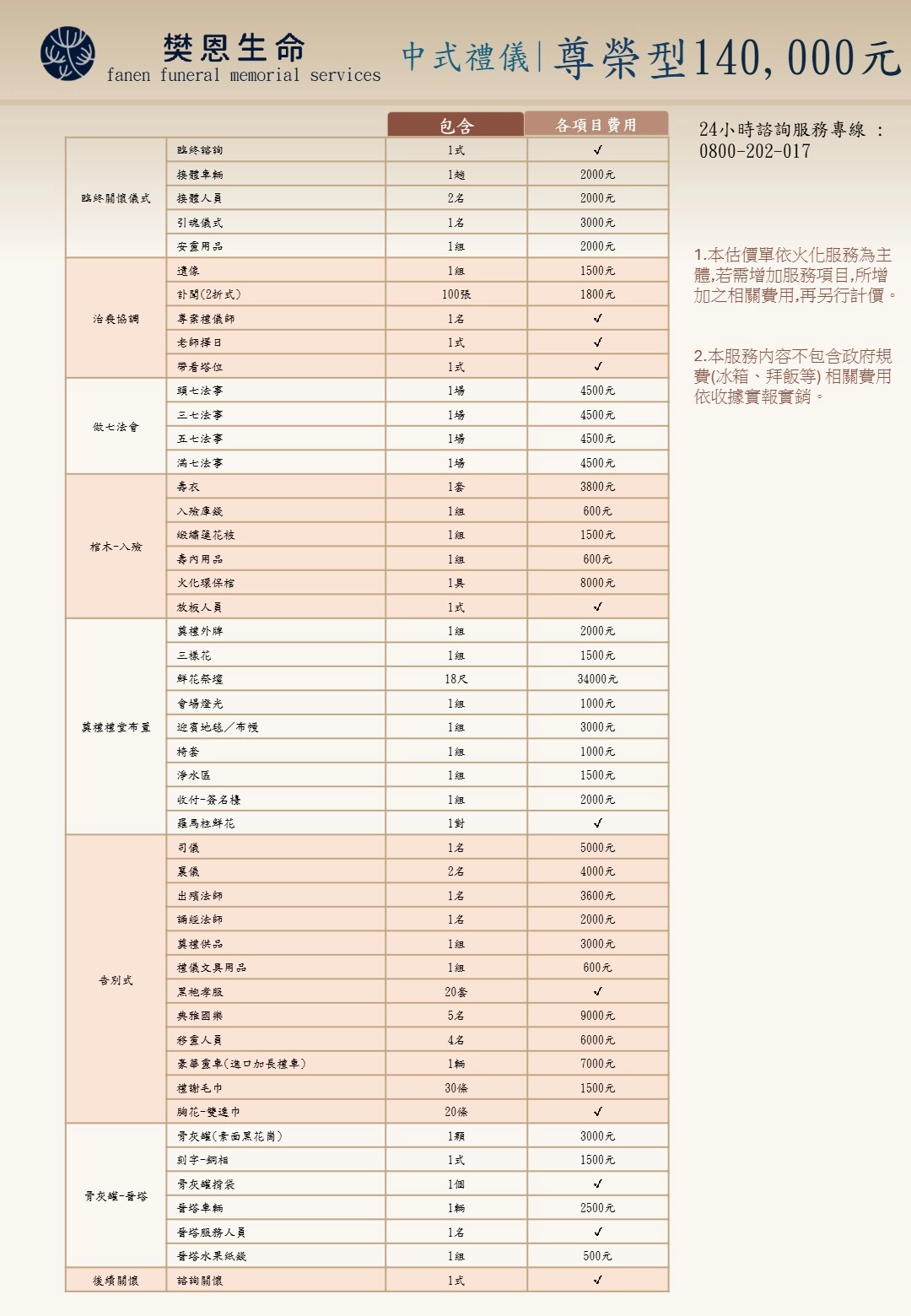 1.本估價單依火化服務為主體,若需增加服務項目,所增 加之相關費用,再另行計價。