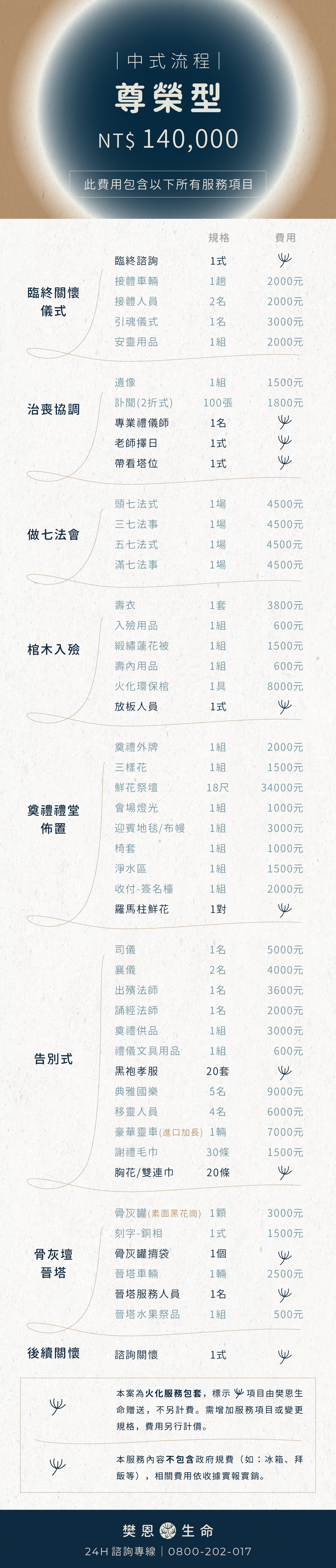 1.本估價單依火化服務為主體,若需增加服務項目,所增 加之相關費用,再另行計價。